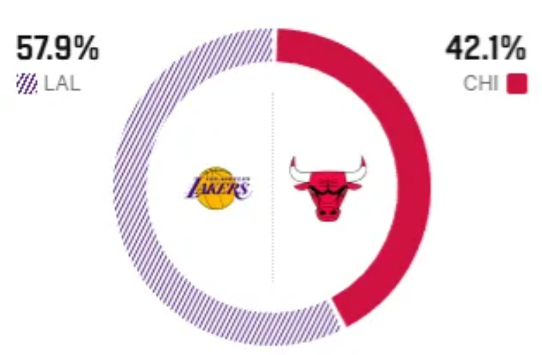 这是两队本赛季的首次交锋,近10次交手,公牛以6胜4负占据优势,上一次交手时,湖人曾被公牛完成惊天大逆转,至今让人印象深刻。赛前,美媒ESPN对本场比赛进行了胜率预测,湖人胜率为57.9%,略占优势,公牛队胜率则仅有42.1%。